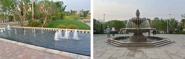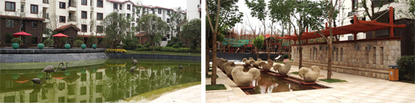 在紫荊東郡小區(qū),水景隨處可見,從主入口兩側近50米的景觀橋水景,到入口正前方一個大型的石雕噴泉,再到小區(qū)里面幾條主干道交匯的十字路口的小型地面噴泉,中心水景上的圓形石雕噴泉,特別是不遠處的動物噴泉雕塑,只只鶴低頭凝思,細長的水流從鼻端的出水口處流出,落入下方的水池里,更是格外引人注目。"這些水景小品具有的藝術特性與審美效果,加強了整個景觀環(huán)境的藝術氛圍,成為讓空間環(huán)境生動起來的關鍵因素,在提高小區(qū)藝術品質和景觀形象的同時,更給人們帶來美的享受。"楊經(jīng)理如是說。