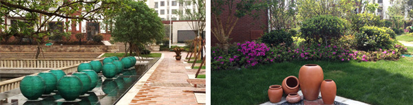 更值得一提的,還有隨處可見的草坪,隨著道路的延伸,草坪時而在不同的植物組團四周鋪展,時而與一棵棵高大的香樟、無患子為鄰,間或在小廣場的四周漫生一片綠意。大面積的草坪應用,使得小區(qū)就像坐落在一片綠色的地毯中,映著白墻紅瓦的建筑,更顯綠意濃濃。不經(jīng)意見,更見幾只高低不一的紅陶瓷罐隨意散落在草坪里,在陽光的照耀下,泛出溫潤的光澤,一段靜謐的時光,仿佛就這樣凝固了。