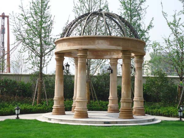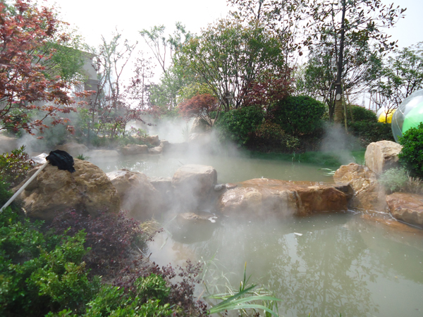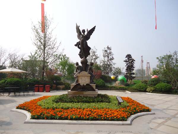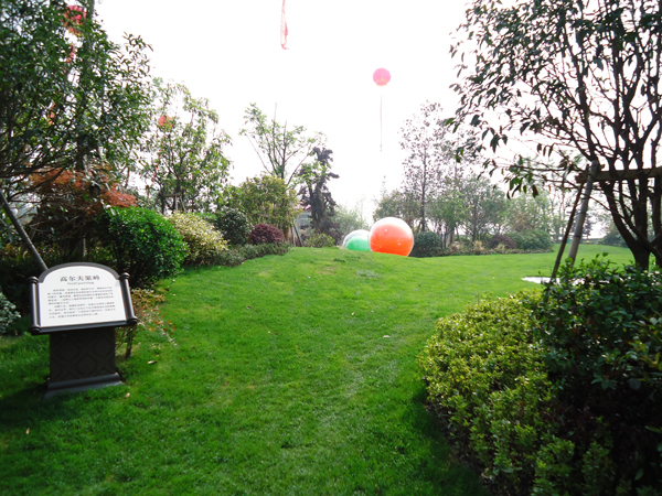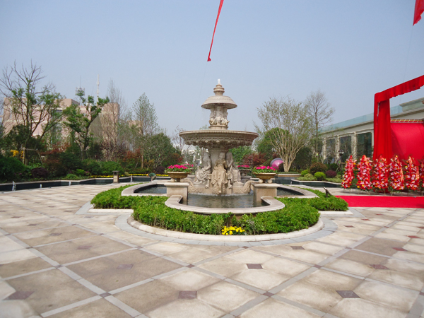 更引人注目的,還有銷售展示中心前面的雕塑噴泉,該噴泉運用花崗巖整石雕刻拼接而成,工藝極其復(fù)雜,自上而下不斷灑落的水花,營造出一片清涼;無以復(fù)加的鏤空鐵藝圓頂繁復(fù)花紋和拱門的石材立面裝飾的皇家景觀亭,精致中透露出大氣;潺潺溪流、霧氣繚繞的人工溪澗,如夢似幻;大面積的高爾夫果嶺草坪蜿蜒起伏,華貴雍容……