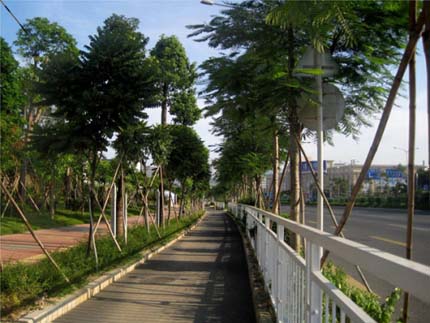 眼前的這條道路開闊大氣、綠色生態(tài),而當初施工時,卻面臨著很多難題。該項目定位較高,工期短,交叉施工嚴重,更經(jīng)歷了濱海的臺風(fēng)季節(jié)天氣,所以施工中對施工工序組織、材料組織及機械勞動力的組織顯得尤為重要;由于施工范圍處于交通繁忙的205國道深圳段,對施工現(xiàn)場車輛的疏導(dǎo)及路邊作業(yè)的圍護等的要求都需嚴格把控;為了保證景觀效果,對苗木的要求比較高,很多假植的苗木需要用保鮮的方法長途運載到施工現(xiàn)場進行種植。“施工中面臨的各種不利因素不但增加了工程成本,更加大了施工難度,但在項目部全體人員工的共同努力下,最終克服種種困難,圓滿完成了任務(wù),展現(xiàn)了杭州市園林綠化工程有限公司優(yōu)質(zhì)高效、創(chuàng)新進取的企業(yè)形象,受到各方的一致好評?!毙煜蛎鞯囊环喍淘捳Z,卻讓我們感受到了施工期間的諸多辛苦。