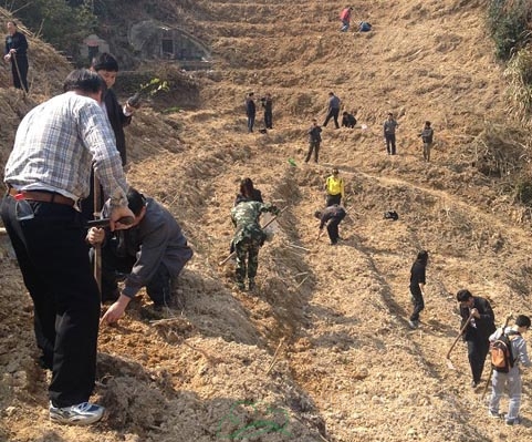此次種植的是油茶小苗,為了提高樹苗的成活率,專門請來當(dāng)?shù)剞r(nóng)民,詳細(xì)講解種植的步驟、間距等種植要點(diǎn)及注意事項(xiàng)。隨后,大家兩人一組,興致高昂地開始了種樹,挖穴、種苗、填土……經(jīng)過一個小時的緊張勞動,500多株油茶樹就種好了。