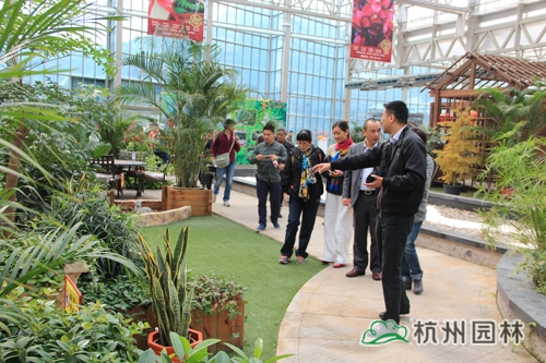 第二天,考察團(tuán)在杭州市園林綠化股份有限公司總裁張炎良、副總裁丁旭升的陪同下參觀了畫境·青山湖花園中心。該花園中心是一個集園藝產(chǎn)品研發(fā)、展示和推廣的現(xiàn)代園林高新技術(shù)平臺,致力于打造庭院設(shè)計、咨詢、建造、養(yǎng)護(hù)等各類功能綜合的一站式園藝服務(wù)中心。項(xiàng)目有近3000畝配套生產(chǎn)基地,12000平米研發(fā)與生產(chǎn)溫室,以及室內(nèi)情景展示區(qū)、園藝展示區(qū),室外陳列展示區(qū)、應(yīng)用展示區(qū)等多個功能區(qū)塊。其中,用于室內(nèi)園藝展示的4000平方米的展覽溫室,引進(jìn)荷蘭PRINS溫室技術(shù),實(shí)現(xiàn)對溫度、光照等全智能控制,是一個技術(shù)含量極高的節(jié)能、環(huán)保型現(xiàn)代溫室。