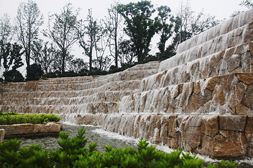 入口水景開(kāi)闊大氣,行道樹(shù)陣整齊劃一。一場(chǎng)歌劇的序曲,不管是澎湃激昂,還是歡快活躍,抑或是柔情舒緩,都將對(duì)整個(gè)局情起著舉足輕重的作用。入口景觀的作用同樣如此,它是整個(gè)園林工程留給人們的第一印象。走進(jìn)項(xiàng)目主入口,寬40米、高10米的寬闊水景,高達(dá)7級(jí)的層階落差,水流層層跌落間,水聲轟鳴,仿佛一道瀑布橫掛眼前。3000平方米的地面鋪裝,全部采用50毫米厚的深灰色和芝麻白花崗巖,走在上面,平坦、踏實(shí)。兩側(cè)的花壇,邊緣鋪設(shè)手法也呈臺(tái)階狀,蘑菇石貼面,花崗巖壓邊,與水景遙相呼應(yīng)。花壇中的植物,上層選用香樟、銀杏、櫸樹(shù),中層用櫻花、紅葉李,下層用麥冬、水蠟、花石榴及草花,再加上造型樹(shù)的點(diǎn)綴,營(yíng)造出群島效果,使得整個(gè)入口景觀莊重典雅,大氣天成。