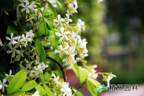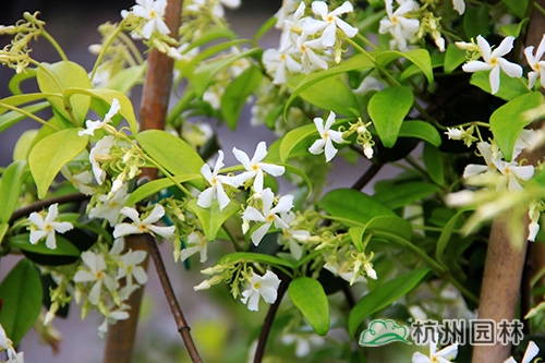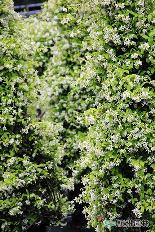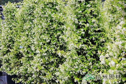 意大利白花絡(luò)石藤(Rhyncospermum jasminoides),俗稱風(fēng)車茉莉,為夾竹桃科的常綠藤本,莖赤褐色,幼枝被黃色柔毛長(zhǎng),有氣生根。常攀緣在樹(shù)木、巖石墻垣上生長(zhǎng),是一流的藤蔓植物,四季常綠。開(kāi)花期在夏季,5月進(jìn)入盛花期,開(kāi)花量極大,有茉莉的香味,聞起來(lái)沁人心脾。