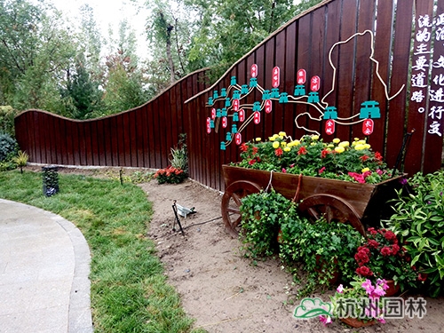 本處已有木制景墻做背景,花境施工前已在幾個(gè)節(jié)點(diǎn)放置了花車、木桶等,并栽植了一棵較高大的紅皮云杉,為花境營造創(chuàng)造了良好的條件。結(jié)合景墻上的文字、地圖,以“陸上絲綢之路”文字為分界點(diǎn),營造“絲?路”、“絲?念”兩組花境。