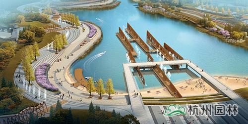 水岸廣場(chǎng):臺(tái)地張弛有度,將臺(tái)階、坡道、草坪、木平臺(tái)、廣場(chǎng)組成豐富的濱水空間,流線型的岸線貫穿整個(gè)臺(tái)地,形成一條觀光濱水走廊,結(jié)合濱水岸線設(shè)置游船碼頭、親水平臺(tái),形成極具特色的水岸廣場(chǎng)。