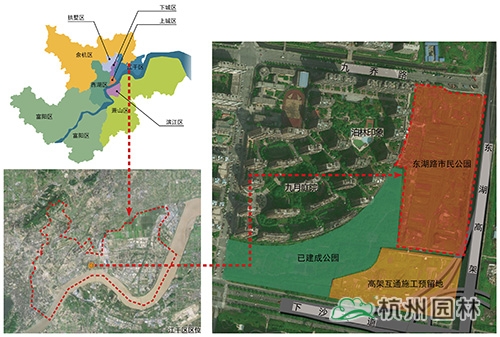 江干區(qū)東湖路市民公園位于東湖路與九喬街西南角,毗鄰九月庭院和泊林印象小區(qū),是江干區(qū)“一帶生態(tài)功能區(qū)”的“運(yùn)河—錢(qián)塘江—東湖路”U型生態(tài)軸的重要節(jié)點(diǎn)。結(jié)合已建成公園和高架互通施工預(yù)留地,對(duì)東湖路市民公園進(jìn)行統(tǒng)一規(guī)劃。