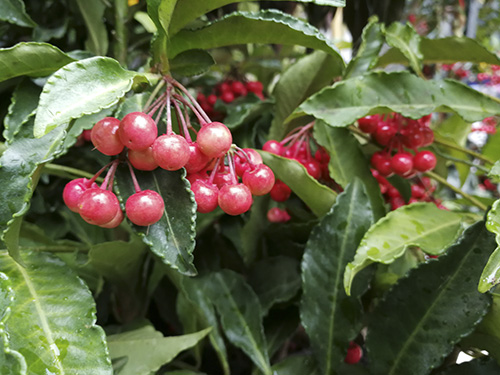 硃砂根的紅果期6個月以上,且株型優(yōu)美,四季常青,紅果艷麗,圓滑晶瑩,與綠葉形成強(qiáng)烈對比,鮮艷奪目,火紅果實給人以溫馨、熱情的美感,增添了喜慶、富貴的氣氛,觀賞性極強(qiáng),是優(yōu)良的觀果觀葉花卉。