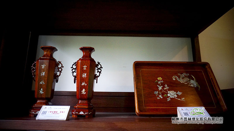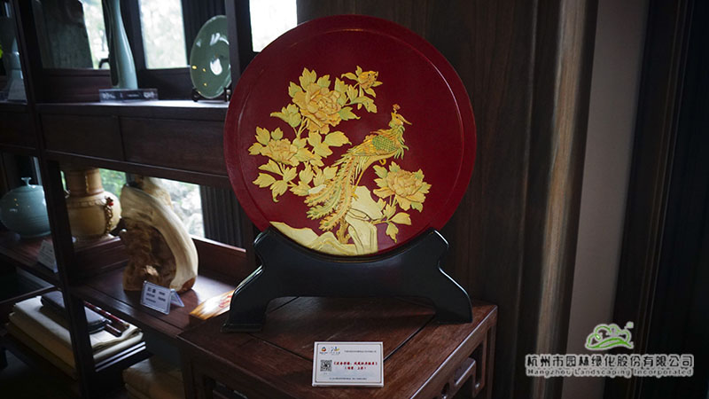 在浙江園的富春山居內(nèi),泥金彩漆、骨木鑲嵌、金銀彩繡等非遺展品也一并展出。泥金彩漆是寧波傳統(tǒng)的“三金”工藝之一,現(xiàn)主要分布于寧波市及其周邊地區(qū)。而骨木鑲嵌則是在木器表面嵌入動(dòng)物骨骼進(jìn)行裝飾,也是寧波的一門特色手工藝。金銀彩繡則是在真絲面料上用各色彩線繡制、金線和銀線盤繡而成的漢族民間手工藝品之一。這些非遺展品展現(xiàn)了寧波深厚的文化底蘊(yùn)與人文精神。