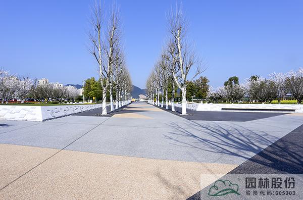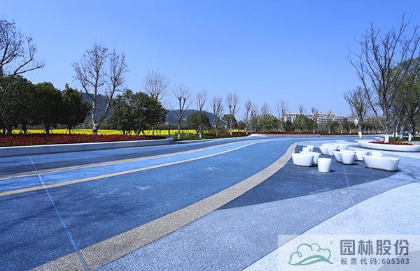 從各個廣場到沿溪綠道,全部采用透水混凝土材料,并在兼顧排水功能的同時,通過色彩、圖案的變化,營造移步換景的濱水景觀。廣場鋪裝主要選用深灰、淺灰、土黃等色彩的透水混凝土材料,根據(jù)現(xiàn)場景觀配色需求,設(shè)計不同的鋪裝組合,營造大氣自然、豐富多變的廣場景觀。靈溪公園入口處的波紋廣場,則以藍(lán)色透水混凝土材料為主,搭配亮麗的黃色,營造出流暢自然、色彩明亮的波紋效果,充滿了流動的旋律,再加上極富特色的異形樹池、坐凳,整個廣場又呈現(xiàn)出時尚的現(xiàn)代風(fēng)情,帶給人們更加豐富的濱水景觀體驗。