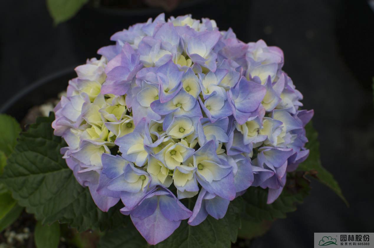 葉片呈卵形,中綠色;扁球狀花,萼片(花瓣)較大,初開(kāi)時(shí)花瓣為亮黃綠色,隨后會(huì)慢慢變?yōu)榧t紫、粉藍(lán)等。盛花期,其花瓣層層疊疊,絢麗多彩,明媚動(dòng)人。杭州5月上旬開(kāi)花,可延續(xù)至6月下旬。