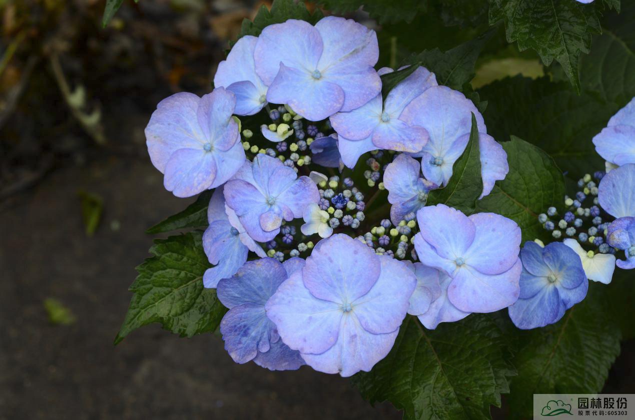 大葉繡球品種間雜交品種;葉片卵形,中綠色;盤狀花,萼片(花瓣)巨大,花色為深紫粉色至鮮紫藍(lán)色,添加調(diào)藍(lán)劑時(shí)可變?yōu)樯钭纤{(lán)色?;ㄩ_(kāi)時(shí),宛如一只只蝴蝶在枝頭翩躚,靈動(dòng)多姿。杭州5月上旬開(kāi)花,可延續(xù)至6月下旬。