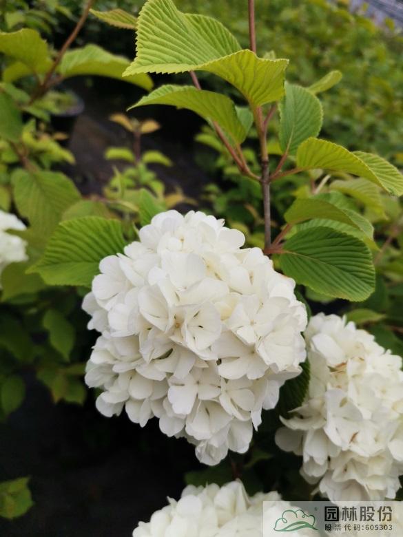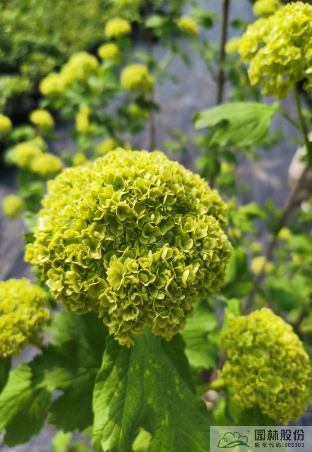 忍冬科莢蒾屬,落葉灌木。葉三裂,秋色葉紅色。聚傘花序,全為不孕花,花大且繁,花色初開綠色,萌萌如綠豆糕,后逐漸變純白。植株萌芽力強,耐寒耐熱,可耐-30℃低溫。生長迅速,適合庭院觀賞。