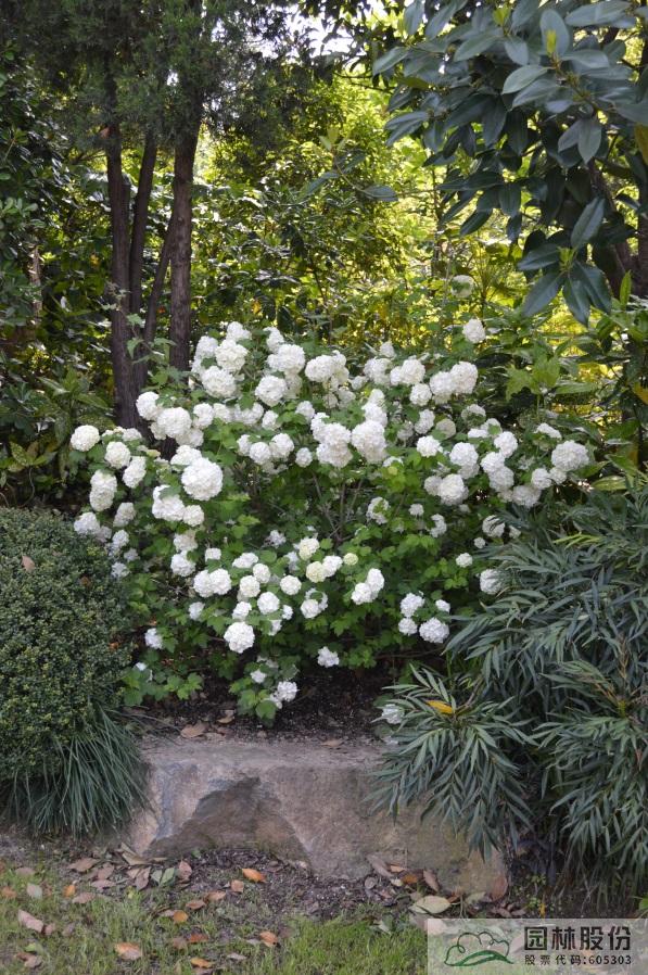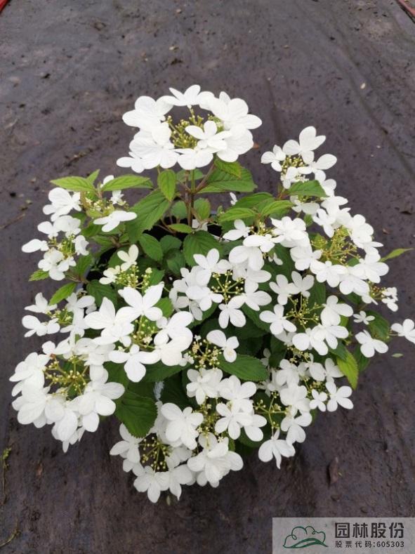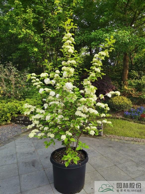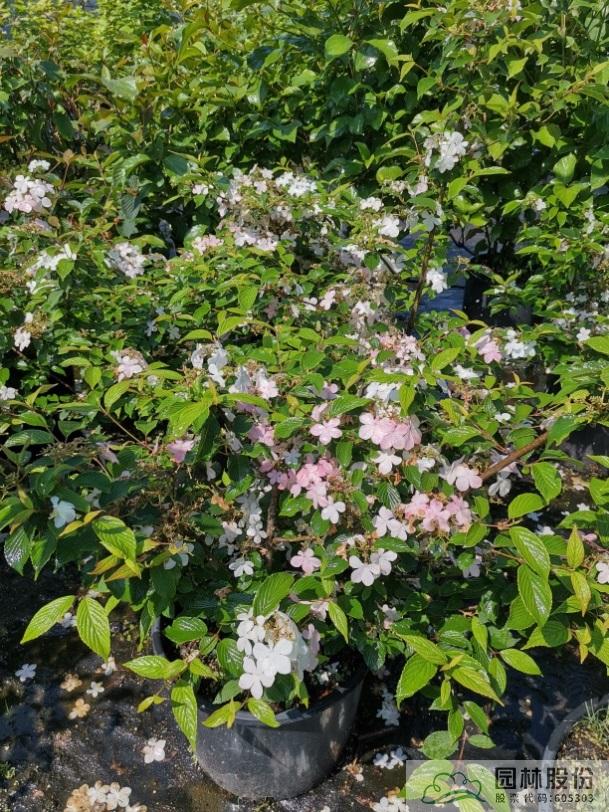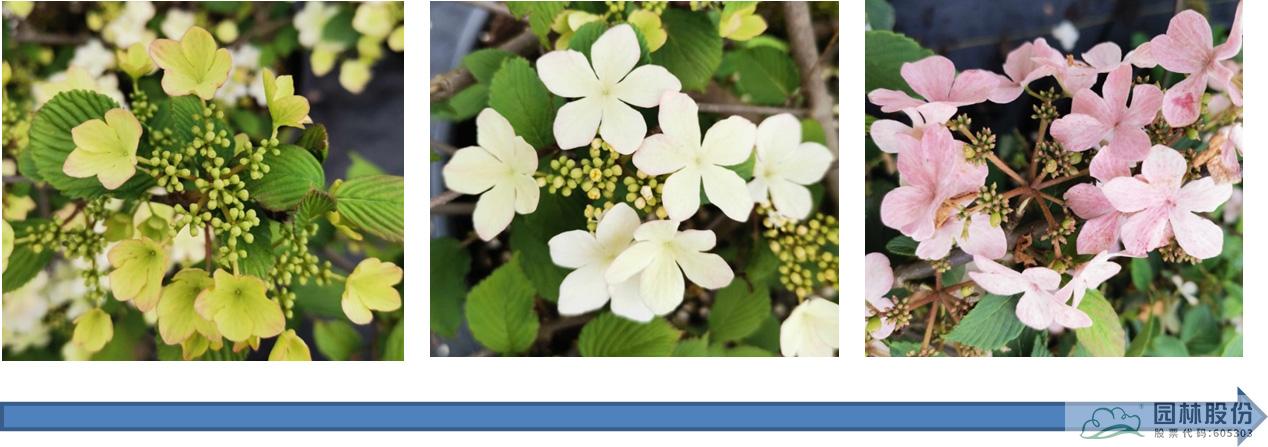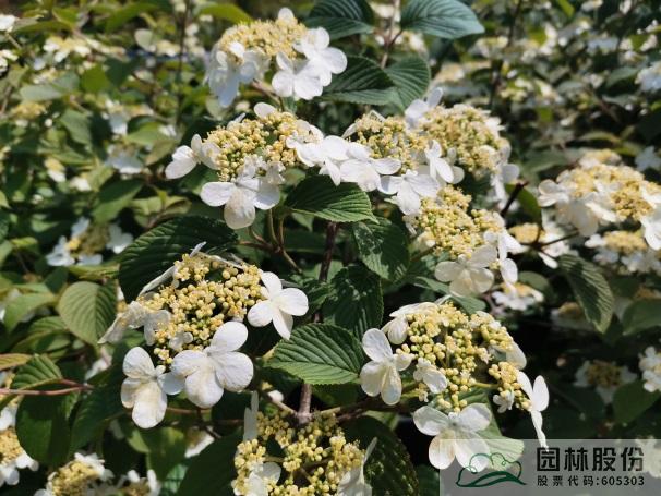 忍冬科莢蒾屬,落葉灌木,樹姿舒展?;ㄐ虬肭蛐危珵椴辉谢?,開花時滿樹白花猶如積雪壓枝,高潔素雅,花謝后則綠葉如碧,無論花葉均具有較好的景觀效果。生長強健,喜歡散射光環(huán)境,適合工程應用或庭院觀賞。