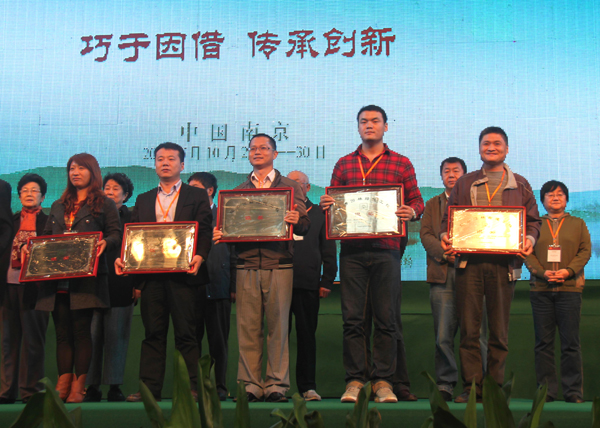 30日下午閉幕式的一個重要環(huán)節(jié)是為2011年度中國風(fēng)景園林學(xué)會優(yōu)秀園林工程獎獲獎單位頒獎。由杭州市園林綠化工程有限公司承建的“昆明市市級黨政機(jī)關(guān)辦公用房搬遷建設(shè)項(xiàng)目區(qū)內(nèi)景觀綠化工程(第三標(biāo)段)”和“吳江市震澤鎮(zhèn)寶塔街西入口沿河、沿街北側(cè)、后花園仿古建筑工程”分別榮獲“中國風(fēng)景園林學(xué)會優(yōu)秀園林綠化工程獎金獎”和“中國風(fēng)景園林學(xué)會優(yōu)秀園林古建工程獎銀獎”。高總代表公司上臺領(lǐng)取了獎牌。