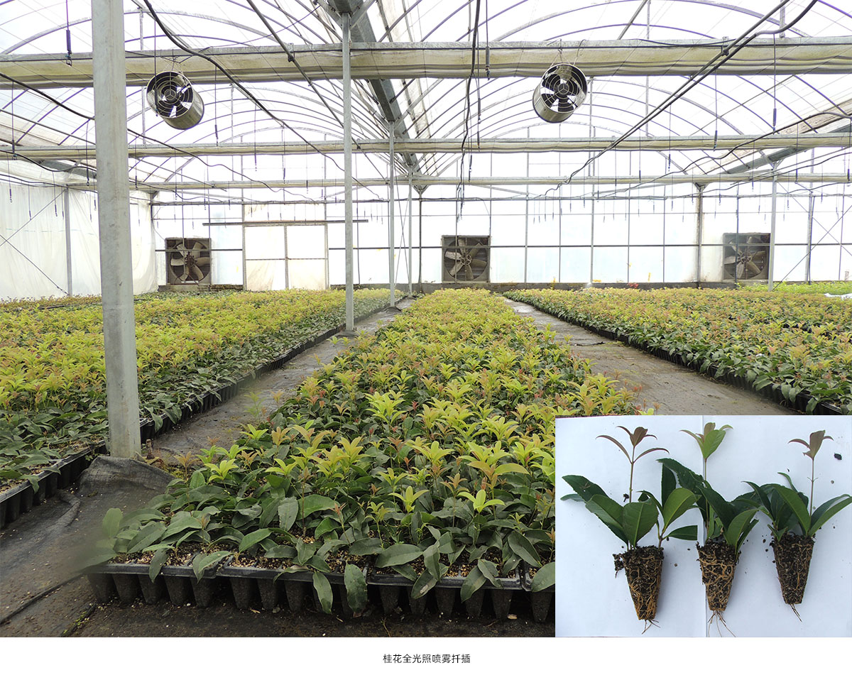 全光照噴霧扦插技術(shù)具有生根期短、成活率高和操作簡單等優(yōu)點(diǎn)。研究院已建立了桂花、冬青、降香黃檀、新優(yōu)宿根植物等數(shù)百種植物的全光照噴霧扦插技術(shù)體系,年度育苗量200多萬。